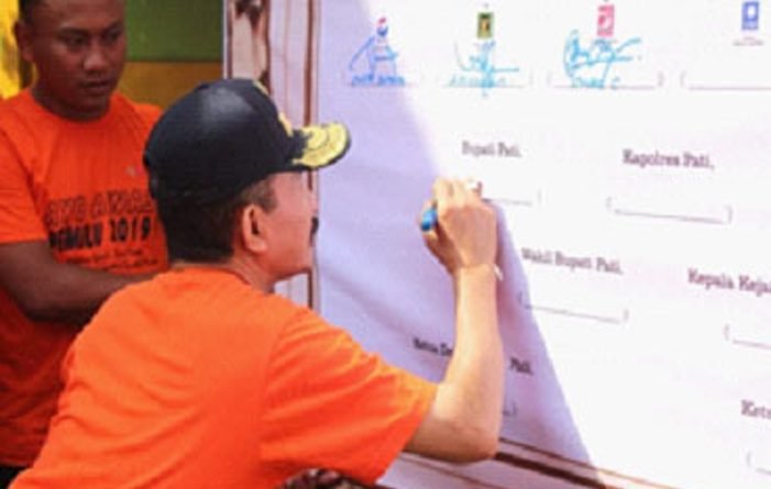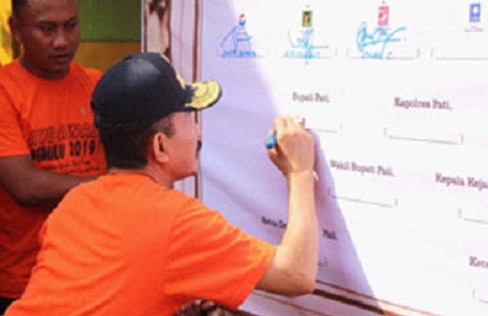 Deklarasi Pemilu Damai disepakati dan dituangkan dalam berita acara serta ditandatangani oleh Bupati beserta Forkompimda, Ketua Bawaslu dan Ketua KPU Pati serta pimpinan Parpol yang hadir. (tim NM/Pati)