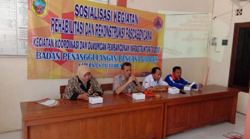 Berdasarkan pertimbangan tersebut, kata salah seorang anggota Komisi D DPRD setempat, Hj Endah Sri Wahyuningati, Kamis (1/11) kemarin, hadir dan menyampaikan sosialisasi kegiatan rehabilitasi dan rekonstruksi pascabencana. Kegiatan tersebut berlangsung di Balai Desa Mustokoharjo, Kecamatan Kota Pati, dan penyampai materi sosialisasi lainnya adalah Kepala Badan Penanggulangan Bencana Daerah (BPBD) setempat, Sanusi Siswoyo.