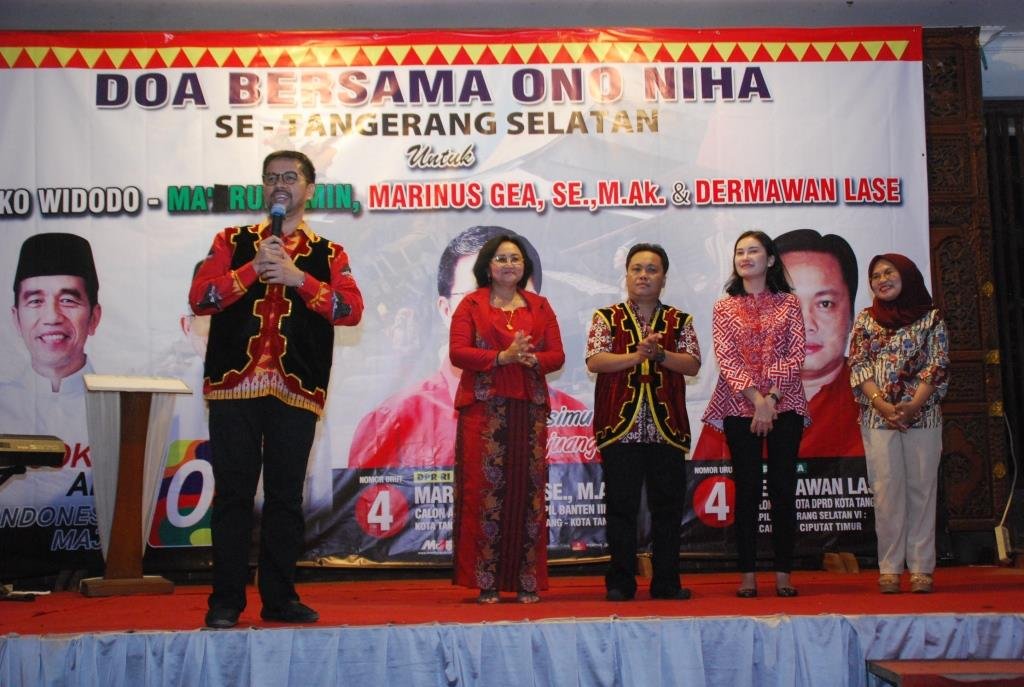 Tangsel,Newsmetro– Doa Bersama Ono Niha (Warga Nias ) Tangerang Selatan yang mendukung Jokowi -Ma’ruf Amin (7/3) Juga Mendoakan Caleg untuk DPR RI Marinus Gea dan Dermawan Lase untuk DPRD Tangsel dimana kedua tokoh ini sama sama punya prestasi baik di organisasi kemasyarakatan juga di organisasi partai.