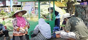 “Maka Pak? makan Bu? Ujar Ratih Wijayanti dan teman-temannya, pengelola Warung Nasi Baru, menawari setiap orang yang datang atau kebetulan lewat untuk makan di warung mereka. “Seribu, Pak. Uangnya silahkan dimasukkan ke dalam kardus,” ujar Ratih pada seseorang yang baru saja selesai makan. Dengan Rp 1.000, pengunjung warung nasi baru bukan hanya memperoleh nasi dan lauk. Mereka juga dipersilakan menikmati es buah serta aneka gorengan, buah, jajan pasar, kerupuk, dan air mineral yang ditata rapi di atas karpet yang digelar di depan dan belakang gerobak.