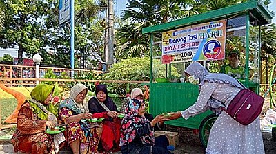 “Maka Pak? makan Bu? Ujar Ratih Wijayanti dan teman-temannya, pengelola Warung Nasi Baru, menawari setiap orang yang datang atau kebetulan lewat untuk makan di warung mereka. “Seribu, Pak. Uangnya silahkan dimasukkan ke dalam kardus,” ujar Ratih pada seseorang yang baru saja selesai makan. Dengan Rp 1.000, pengunjung warung nasi baru bukan hanya memperoleh nasi dan lauk. Mereka juga dipersilakan menikmati es buah serta aneka gorengan, buah, jajan pasar, kerupuk, dan air mineral yang ditata rapi di atas karpet yang digelar di depan dan belakang gerobak.