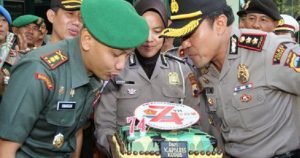 KUDUS NEWSMETRO.CO – Dalam rangka HUT TNI Ke- 74 Tahun Kapolres Kudus AKBP Saptono didampingi Wakapolres, bersama PJU Polres Kudus melaksanakan kunjungan silaturohim di Kodim 0722/Kudus. Tujuan utamanya adalah untuk mengucapkan selamat HUT TNI ke 74 tahun 2019. Serta memberikan kejutan dengan memberikan Kue Tart berbentuk seragam TNI dan tumpeng kepada Letkol Irwansyah Dandim 0722/Kudus. Jumat (4/10/2019) pagi.