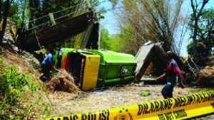 “Sebetulnya saya mau lewat jalan lain, tapi karena sedang dicor, saya pun lewat jembatan ini.” “Enggak tahunya saat melintas tiba-tiba terdengar bunyi braaakkk braakk braaakkk dan saya terguling ke bawah.” “Rencana mau datangkan crane, cuma agak lama karena akses masuk desa yang jauh dan rusak jalannya,”ujar Sutrisno.