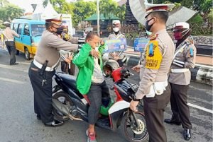 KUDUS, NEWSMETRO.CO – Puluhan pengendara yang melintas di kawasan Alun-alun Simpang Tujuh Kudus di-stop anggota Satlantas Polres Kudus. Mereka diberhentikan bukan untuk diperiksa terkait kelengkapan surat kendaraan. Melainkan karena para pengendara ini, masih bandel tidak memakai masker saat beraktivitas di luar rumah.