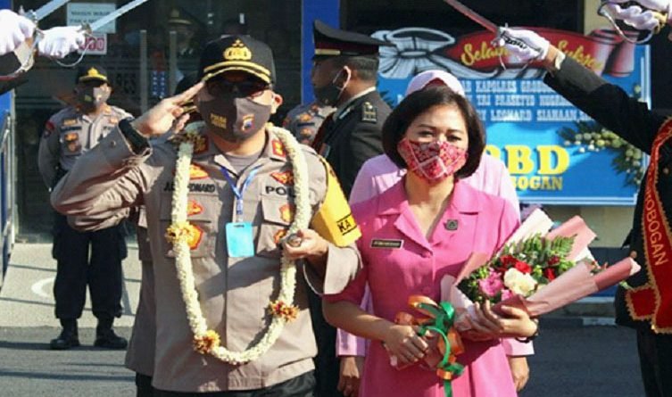 GROBOGAN, NEWSMETRO.CO – Pergantian Kapolres Grobogan digelar dengan tradisi pedang pora di halaman Mapolres setempat pada Kamis (18/6/2020). Tongkat komando Kapolres Grobogan yang semula dipegang AKBP Ronny Tri Prasetyo Nugroho kini berpindah ke tangan AKBP Jury Leonard Siahaan.