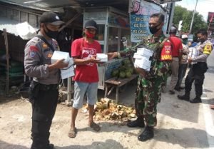JATENG7.PATI – Kegiatan Bakti sosial (Bhaksos) Personil Polsek Kayen dan Babinsa Koramil Kayen yang di pimpin langsung oleh Waka Polsek Kayen Iptu Suwanto membagikan nasi kotak kepada warga Kecamatan Kayen yang sedang bekerja di bengkel, di sawah maupun di jalan, Jum’at (25/09/2020) pagi, pukul 09.00 wib.
