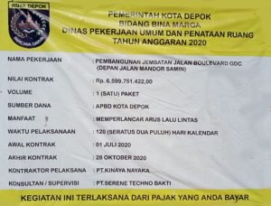 DEPOK, NEWSMETRO.CO – Untuk mengantisipasi terjadi Korupsi Kolusi dan Nepotisme, Setiap Proyek Pemerintah, mulai dari Daerah sampai ke Pusat diwajibkan memasang papan pengumuman atau lazim disebut papan proyek.