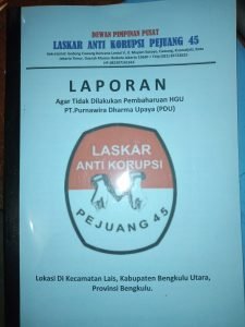 Terkait dengan rencana pemerintah dalam melakukan reformasi Agraria di tanah air, hal ini dimanfaatkan oleh Pengurus Pusat Laskar Anti Korupsi Pejuang 45 untuk melaporkan sengketa tanah PT. Purnawira Dharma Upaya dengan warga 11 desa penjangga di Kecamatan Lais, Kabupaten Bengkulu Utara, Provinsi Bengkulu seluas 4000 Ha.