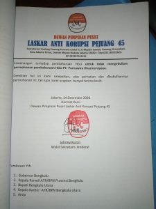 Informasi yang diperoleh NEWSMETRO.CO jika tidak ada aral melintang, Senin (14/12/2020) Wakil Sekretaris Jenderal (Wasekjen) Dewan Pimpinan Pusat (DPP) Laskar Anti Korupsi Pejuang 45 (Laki P. 45) Johnny Kuron akan melaporkan lahan milik masyarakat yang diduga sejak Tahun 2007 dicaplok oleh PT. Purnawira Dharma Upaya ke Presiden Jokowi, Kepala Staf Kepresidenan Moeldoko dan Menteri Agraria dan Tata Ruang/BPN, Sofyan A. Djalil.