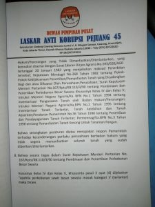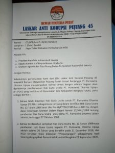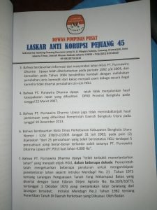 Terkait dengan rencana pemerintah dalam melakukan reformasi Agraria di tanah air, hal ini dimanfaatkan oleh Pengurus Pusat Laskar Anti Korupsi Pejuang 45 untuk melaporkan sengketa tanah PT. Purnawira Dharma Upaya dengan warga 11 desa penjangga di Kecamatan Lais, Kabupaten Bengkulu Utara, Provinsi Bengkulu seluas 4000 Ha.