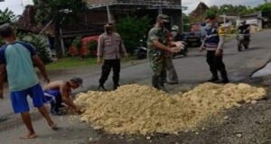 PATI.NEWSMETRO.CO – Untuk mengantisipasi dan mencegah terjadinya kecelakaan yang disebabkan jalan rusak dan berlubang, Personil Koramil 20/Tambakromo dan Polsek Tambakromo serta warga masyarakat bergotong-royong menambal jalan rusak dan berlubang akibat tergerus air di jalan utama wilayah Kecamatan Tambakromo Kabupaten Pati, tepatnya di Desa Angkatanlor, Kedalingan dan Karangmulyo, Rabu (26/1/2022).