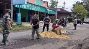 “Untuk itu, kami TNI Polri selaku aparat kewilayahan secara sukarela melakukan perbaikan jalan yang sifatnya sementara dengan cara menutup lubang dengan menggunakan batu kapur. Sehingga diharapkan dapat mengurangi terjadinya kecelakaan bagi pengguna jalan,” Tandasnya.