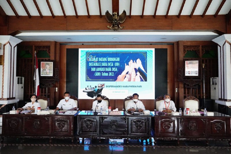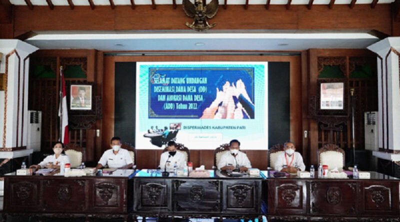 PATI.NEWSMETRO.CO – Sosialisasi Diseminasi Dana Desa (DD) dan Alokasi Dana Desa (ADD) Tahun 2022 dilaksanakan di Pendopo Kabupaten Pati dan secara virtual melalui Zoom meeting pada Rabu (26/1/2022). Kegiatan sosialisasi ini dihadiri oleh Bupati Pati Haryanto, Kepala Dispermades, Kepala BPKAD, kepala KPPN Pati, para camat dan kepala desa serta pejabat terkait.