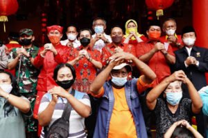 Bupati Pati Haryanto bersama jajaran Forkopimda turut membagikan sembako untuk masyarakat. Mereka antre menunggu sembako itu diserahkan oleh Bupati dengan membawa kupon yang telah dibagikan oleh pengelola klenteng.