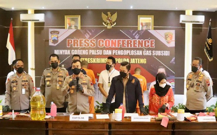 Dalam keterangan persnya Kapolda Jateng mengungkapkan dua tersangka yang diamankan aparat Direktorat Reskrimsus Polda Jateng masing-masing berinisial MNK dan AA, dan keduanya melakukan aksi pengoplosan minyak goreng di Desa Cendono Kecamatan Dawe Kudus.