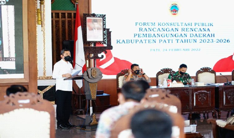PATI-NEWSMTERO.CO – Bupati Pati Haryanto menyebut bahwa kemajuan pembangunan di daerah, tidak hanya dipandang dari sudut pembangunan infrastruktur saja melainkan dilihat juga perlu ditinjau dari secara makro. Hal tersebut ia sampaikan dalam Forum Konsultasi Publik Rancangan Rencana Pembangunan Daerah (RPD) tahun 2023 – 2026 di Pendopo Kabupaten Pati, Kamis (24/2/2022).