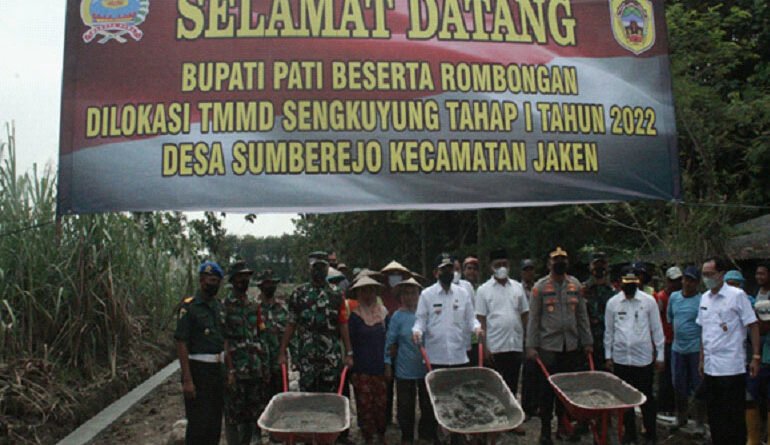 PATI-NEWSMETRO.CO – Pati-Program unggulan TNI AD yang dikemas dalam TNI Manunggal Membangun Desa (TMMD) Sengkuyung Tahap I Tahun Anggaran 2022 di wilayah kabupaten Pati hari ini secara resmi dibuka oleh Bupati Pati H. Haryanto, S.H., M.M., M.Si bersama Dandim 0718/Pati Letkol Inf Catur Irawan, S.I.P., M.I.P. serta Kapolres Pati AKBP Christian Tobing, S.I.K., M.H., M.S.i. Program TMMD Sengkuyung Tahap I digulirkan di dua desa yakni desa Sumberejo kecamatan Jaken dan di desa Grogolan Kecamatan Dukuhseti.