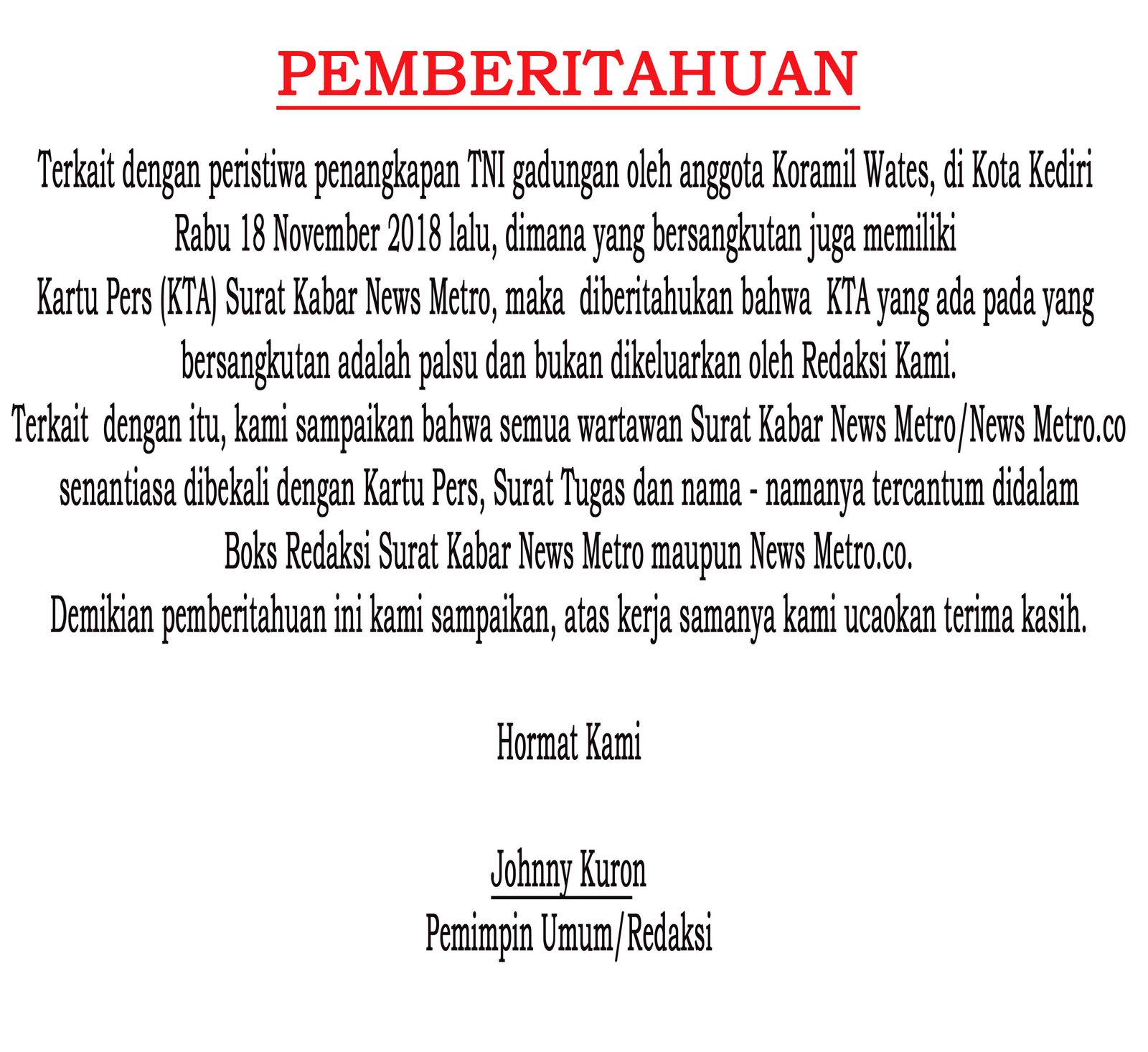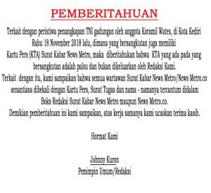 DIberitahukan Kepada Instansi Pemerintah TNI Polri dan Swasta bahwa semua wartawan Surat Kabar maupun Online NEWSMETRO.CO senantiasa dibekali dengan kartu PERS dan nama - namanya tercantum didalam boks redaksi. Jika namanya tidak tercantum didalam boks redaksi bukan tanggung jawab kami. Hati - hati !!! Kartu Pers Bukan Jaminan Sebab Bisa Dipalsukan